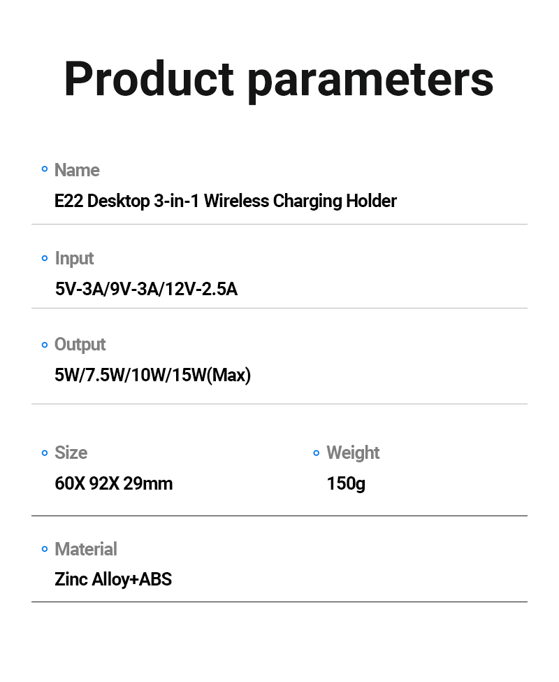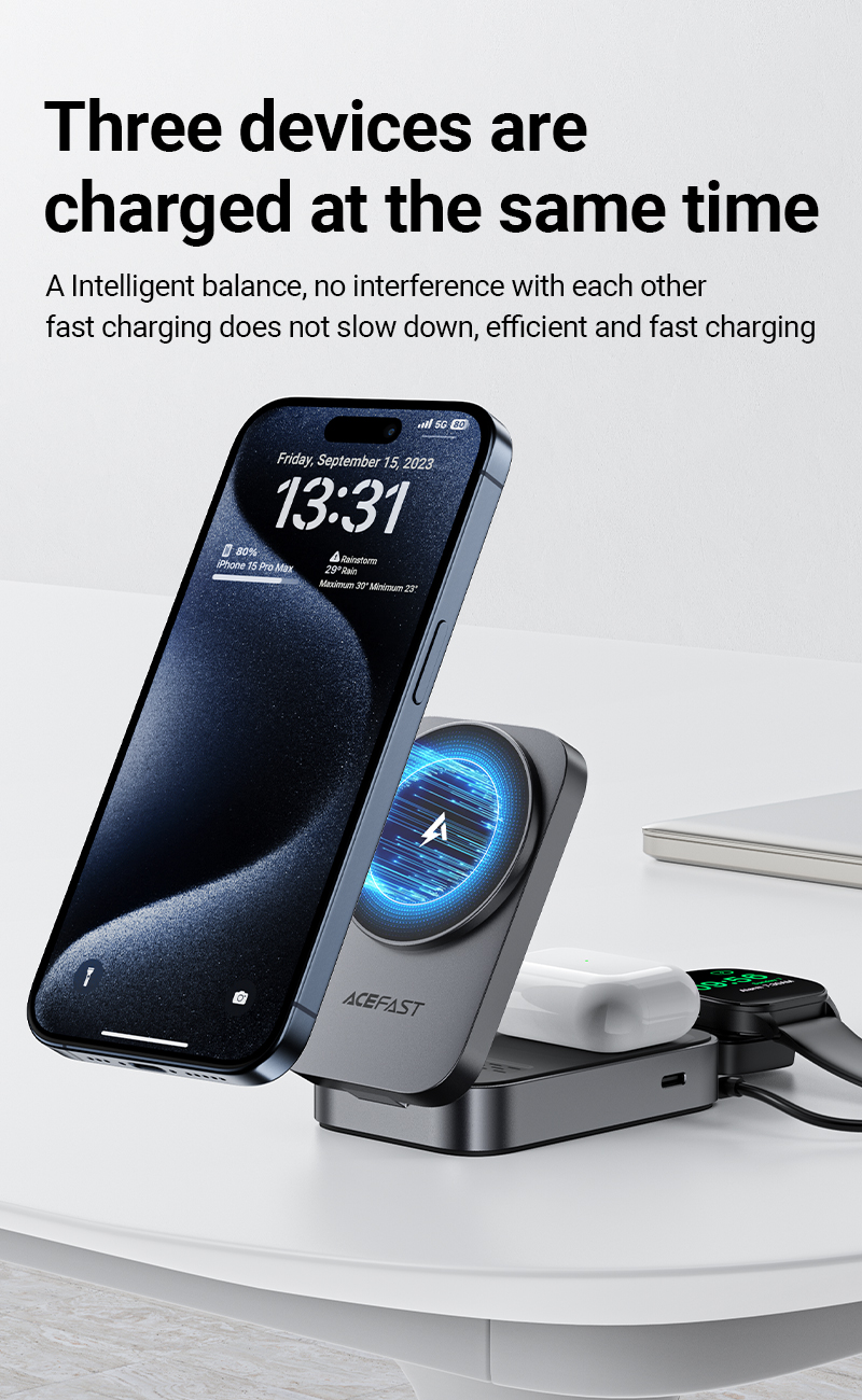 • 3-in-1 Wireless Charging – Simultaneously charges your smartphone, smartwatch, and wireless earbuds, powering three devices at once with a single compact station.