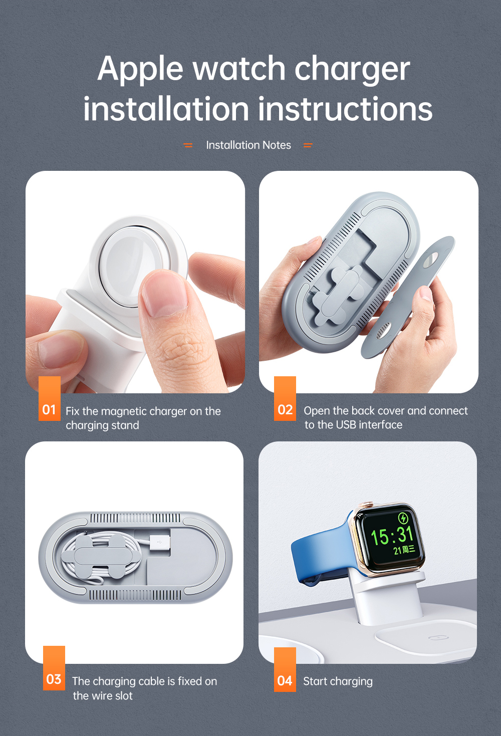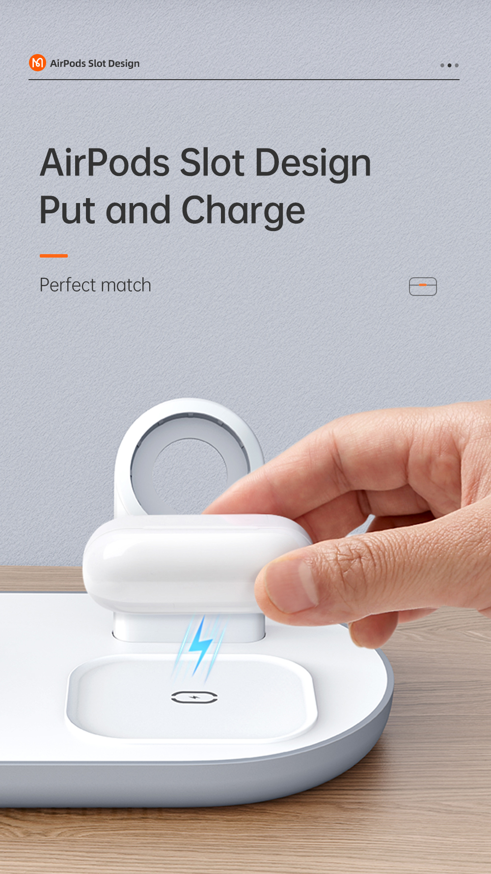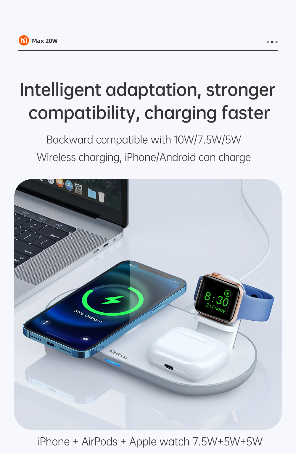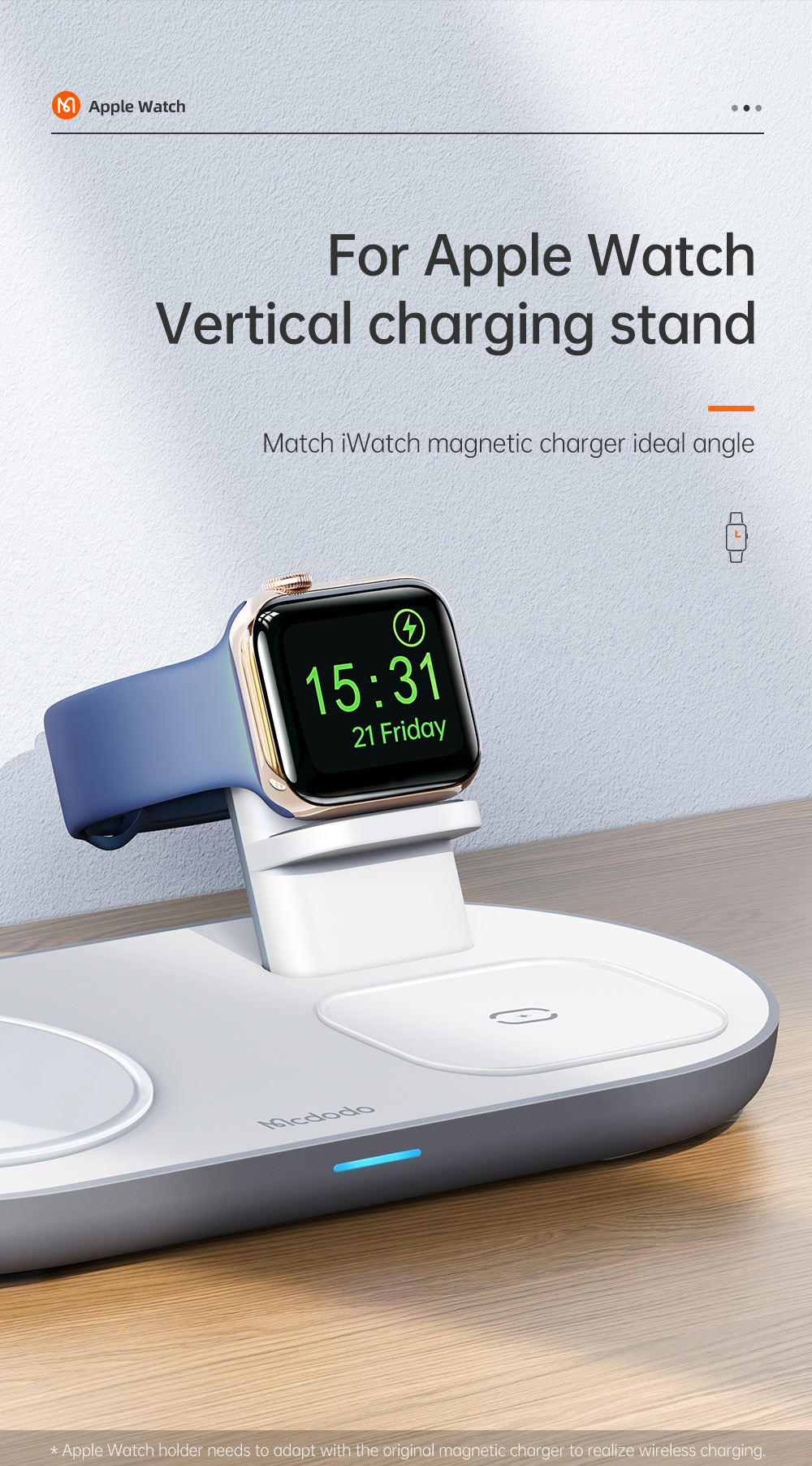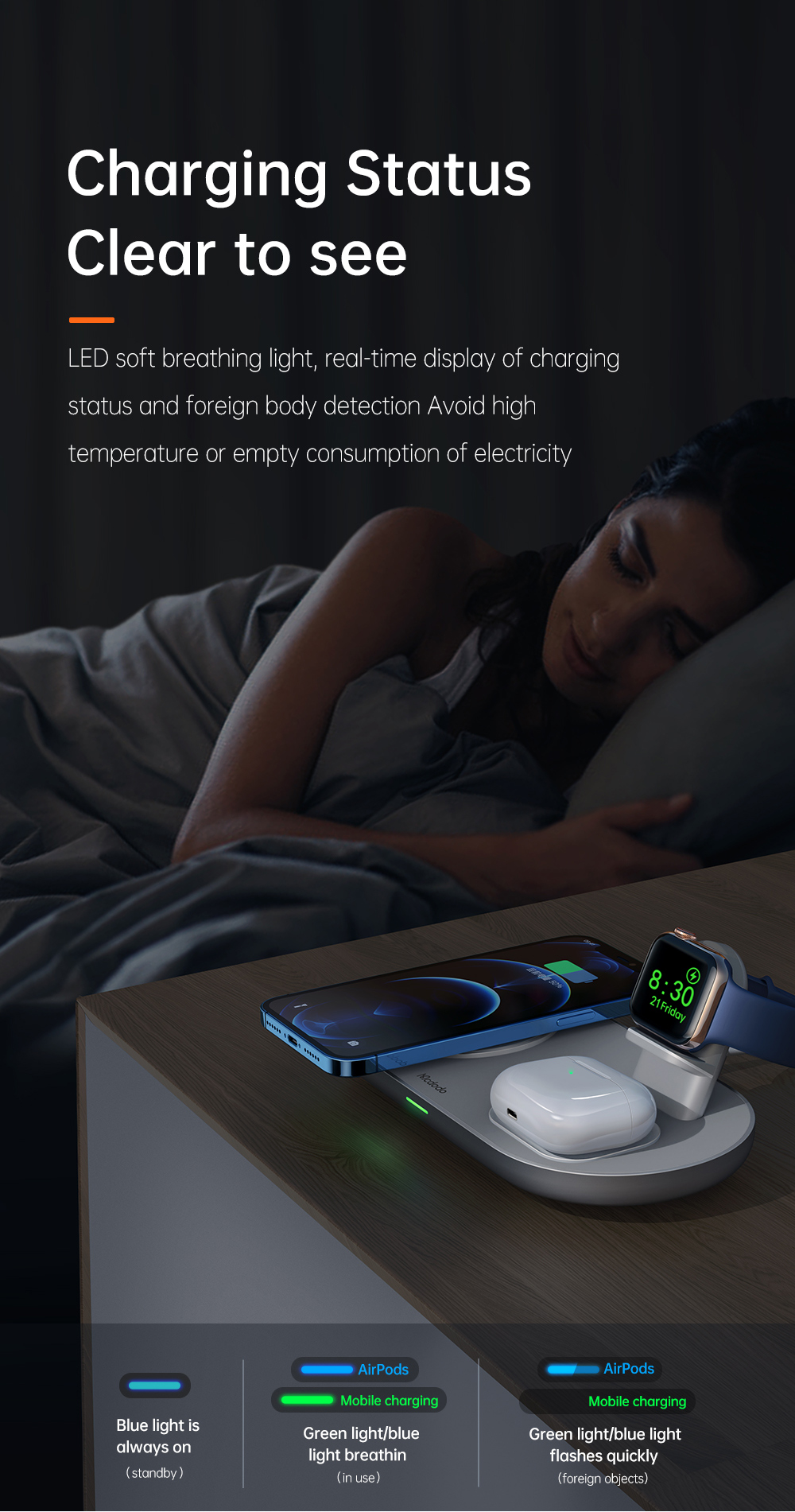 1. 3-in-1 Wireless Charging: Supports simultaneous charging for smartphone, TWS earphones, and Apple Watch.