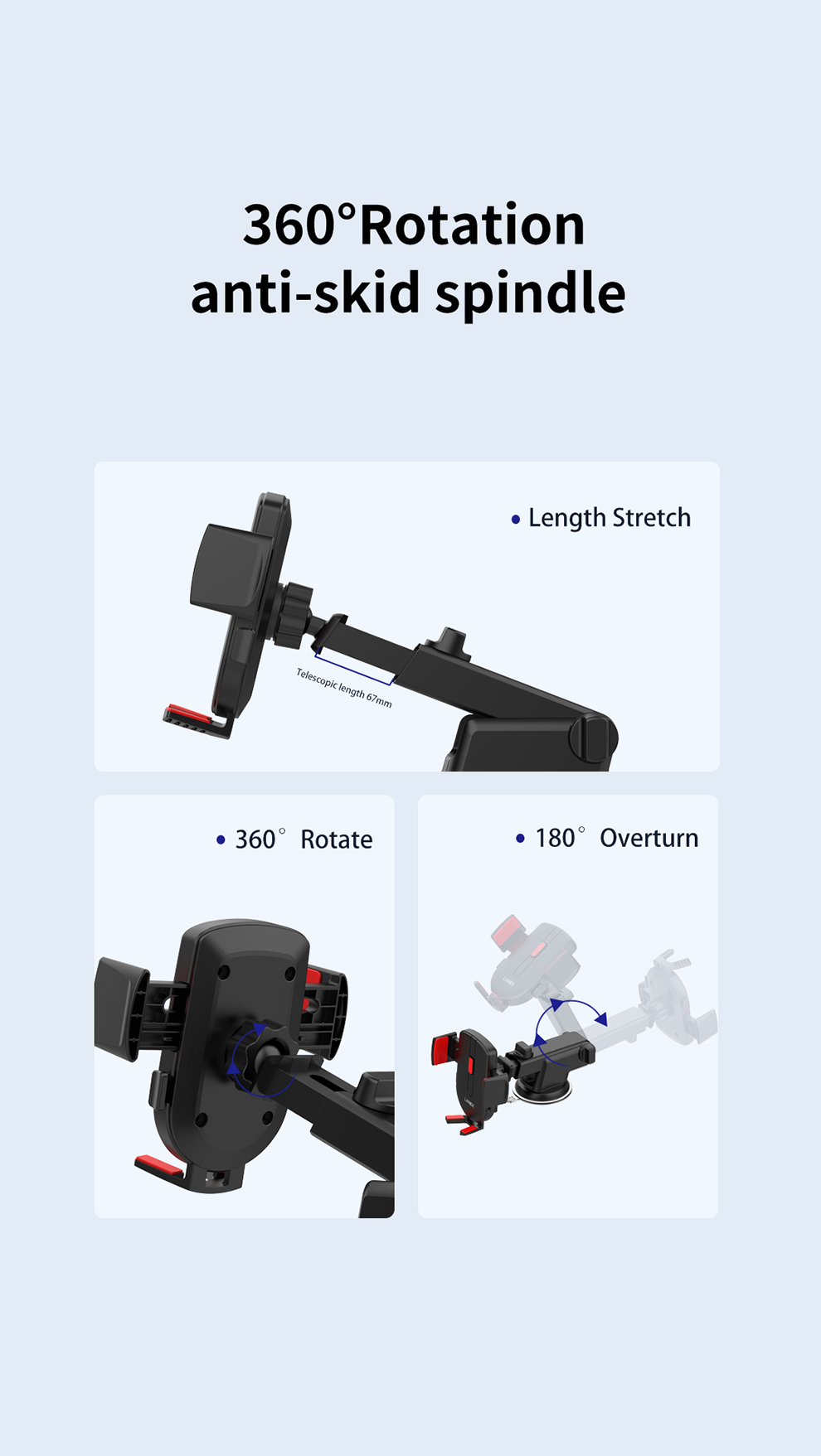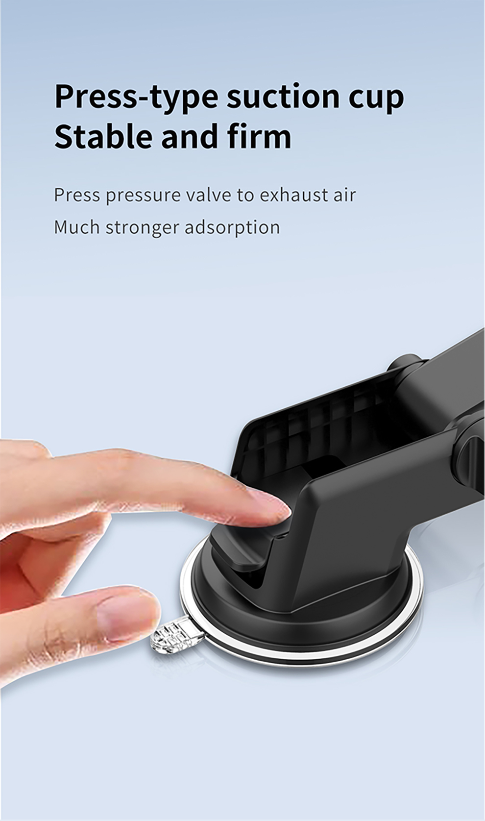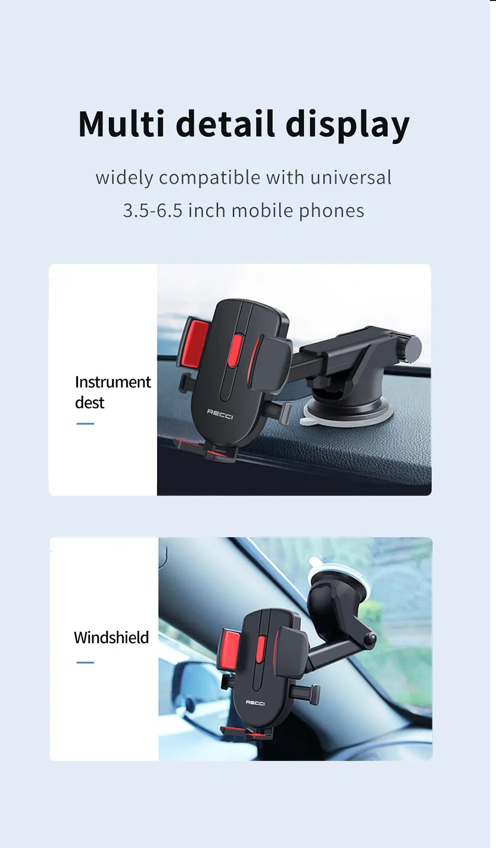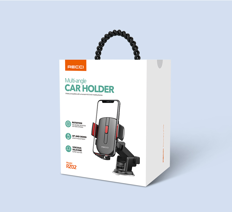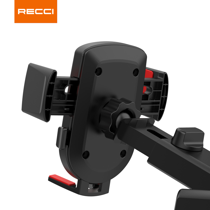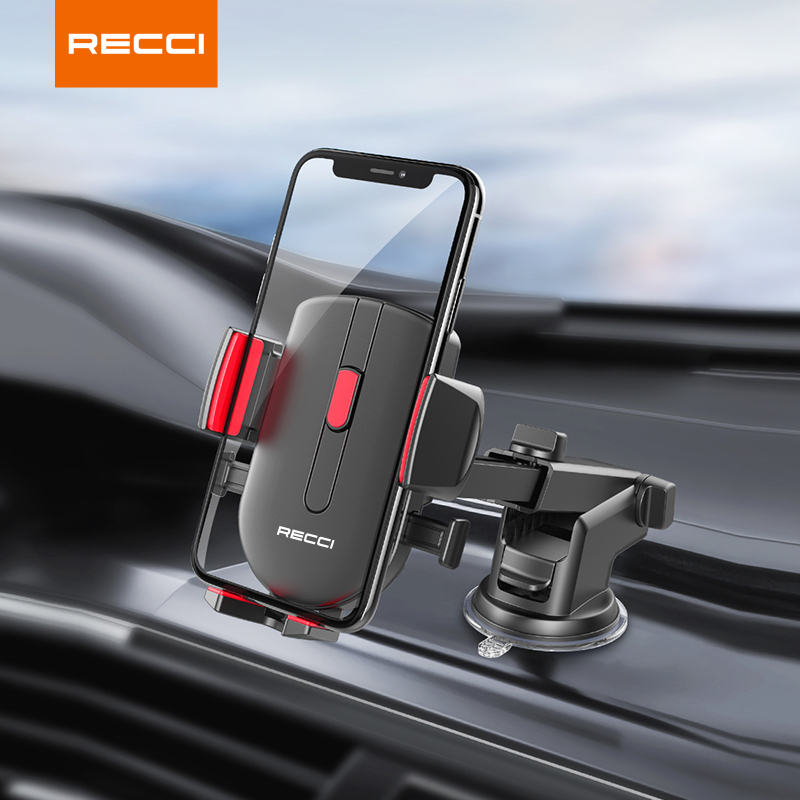 Recci RZ02 Car Mobile Holder: press-type suction cup for strong, stable grip, repeated adsorption, 360° rotation with anti-skid spindle, detailed design, durable build, and backed by a 1-year warranty for reliability.