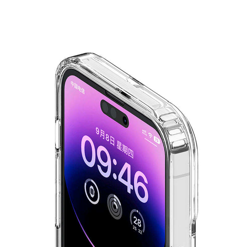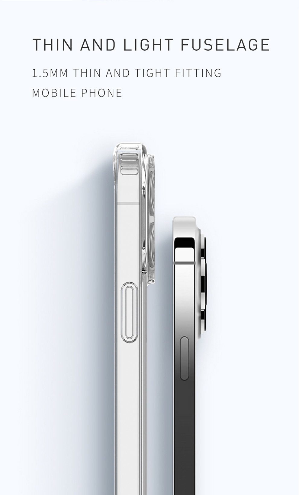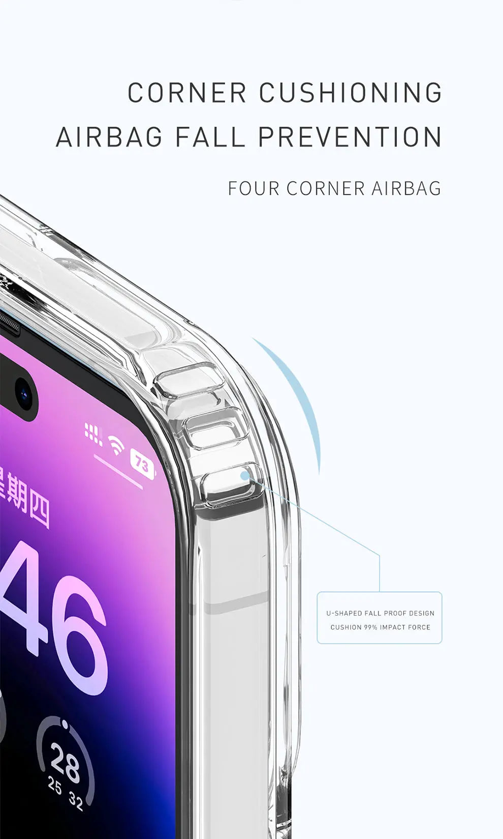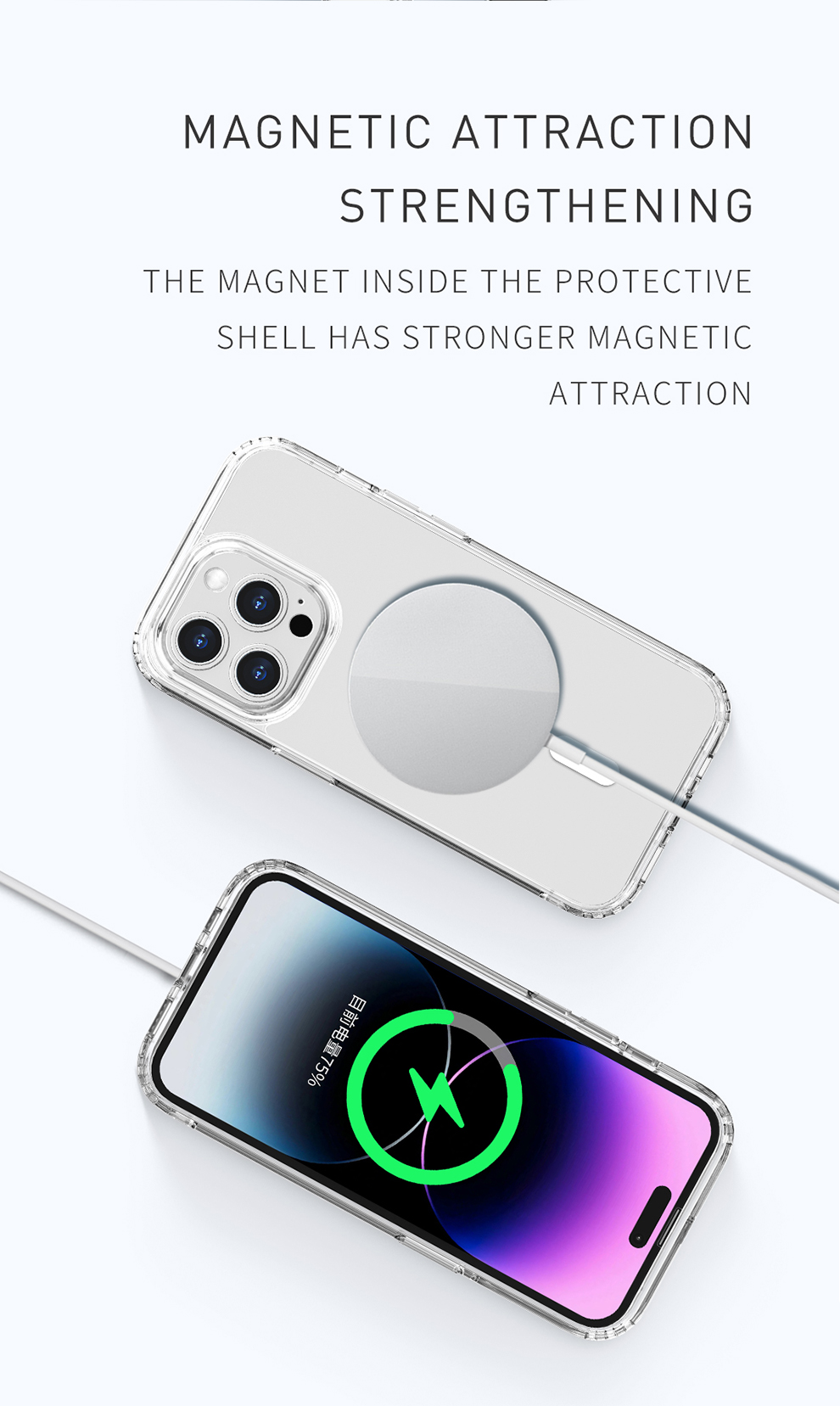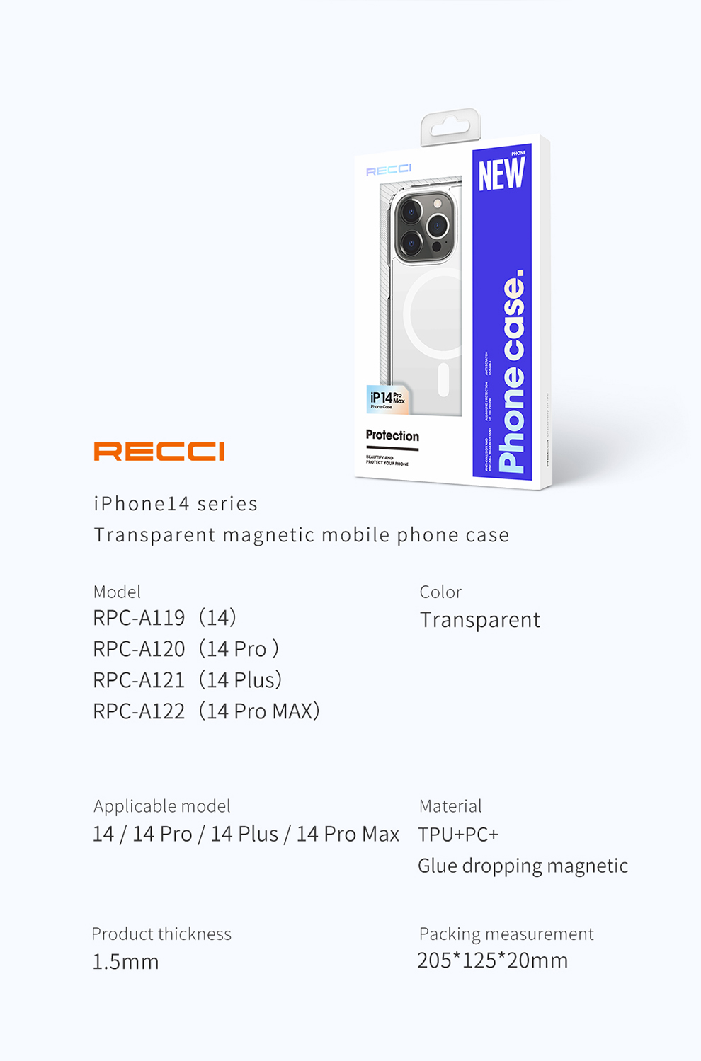 Magnetic ring case RPC-A120 for iPhone 14 Pro: transparent, anti-yellowing, four-corner protection, made of TPU, PC, and glue-dropped magnetic material, durable and stylish with strong magnetic compatibility for charger and holder.