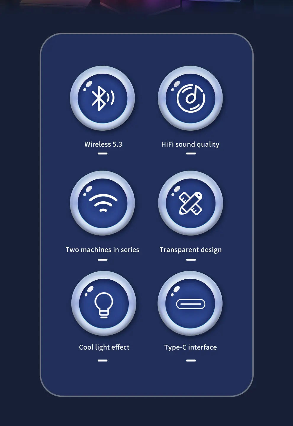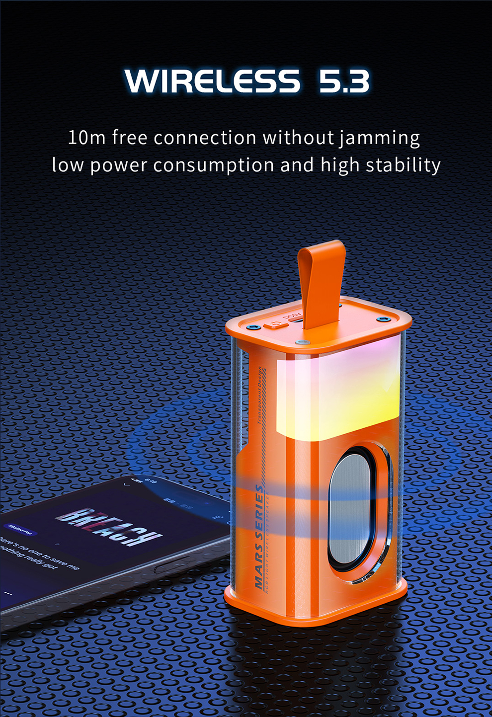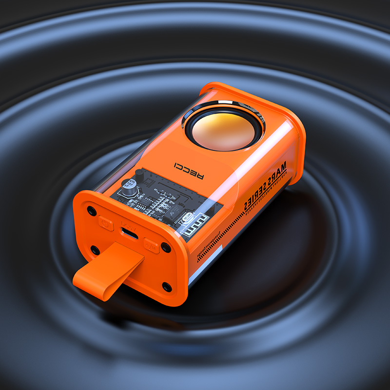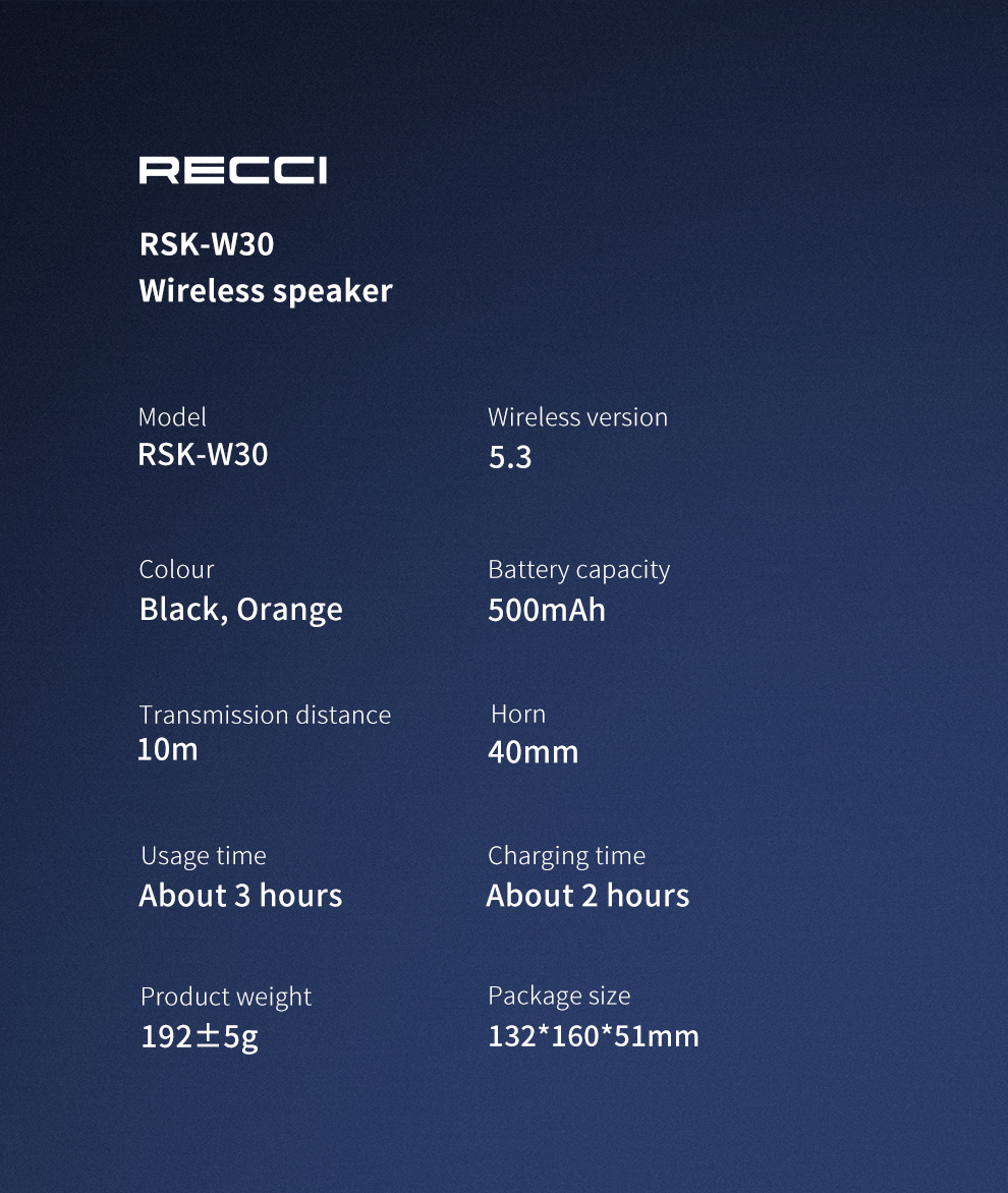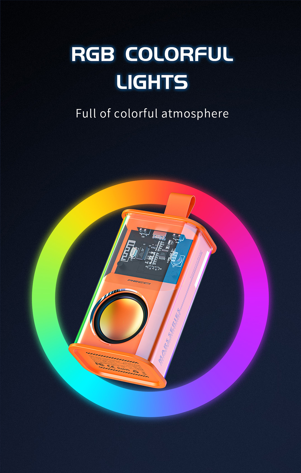 Recci RSK-W30 Speaker: transparent design, HiFi sound, Bluetooth 5.3, cool RGB lights, TWS dual-channel support, Type-C charging, two speakers connect in series, up to 3 hours playtime, stylish and powerful audio.