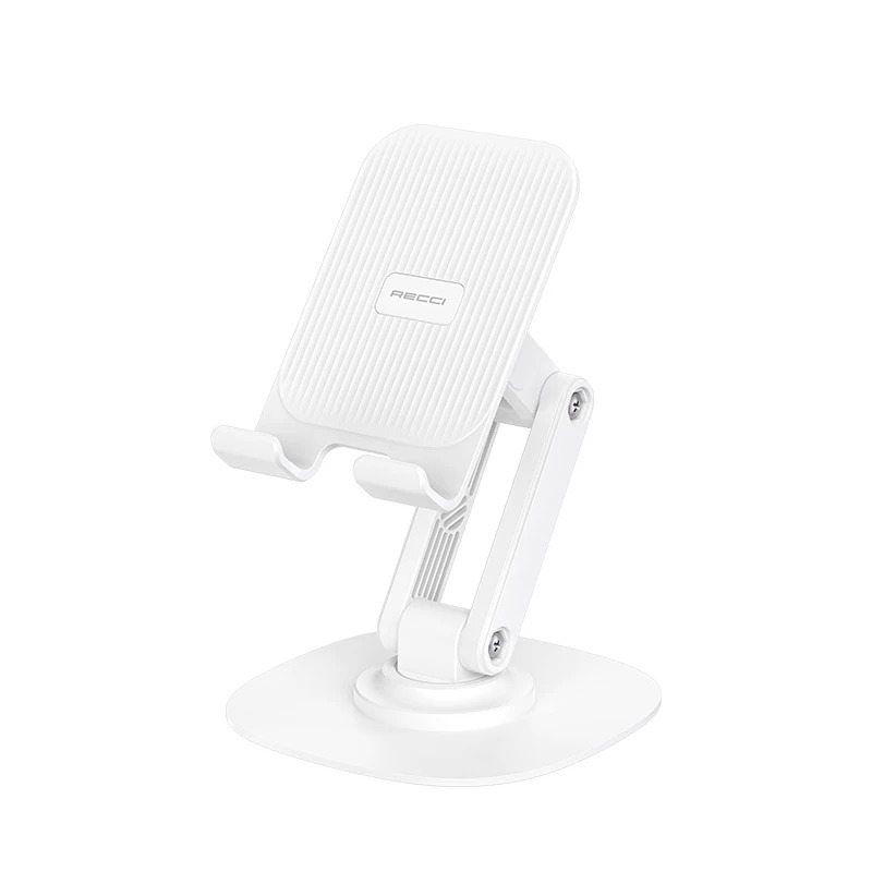 Recci RHO-M20 Mobile Stand: 360° rotation, 180° tilt, heavy metal base for stability, foldable for space-saving, bottom grooves and cushions protect phone from moisture and scratches, practical and durable design.
