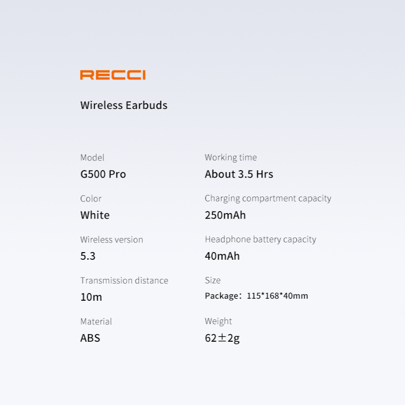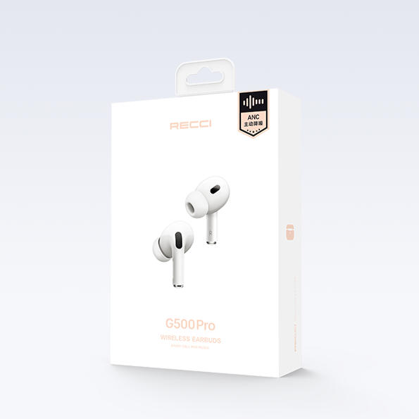 Recci TWS G500 Pro ANC earbuds: 10mm drivers, Bluetooth 5.2, active noise cancelling, transparency mode, touch control, IPX7 waterproof, 30-hour battery, USB-C fast charge, comfortable fit, voice assistant support.