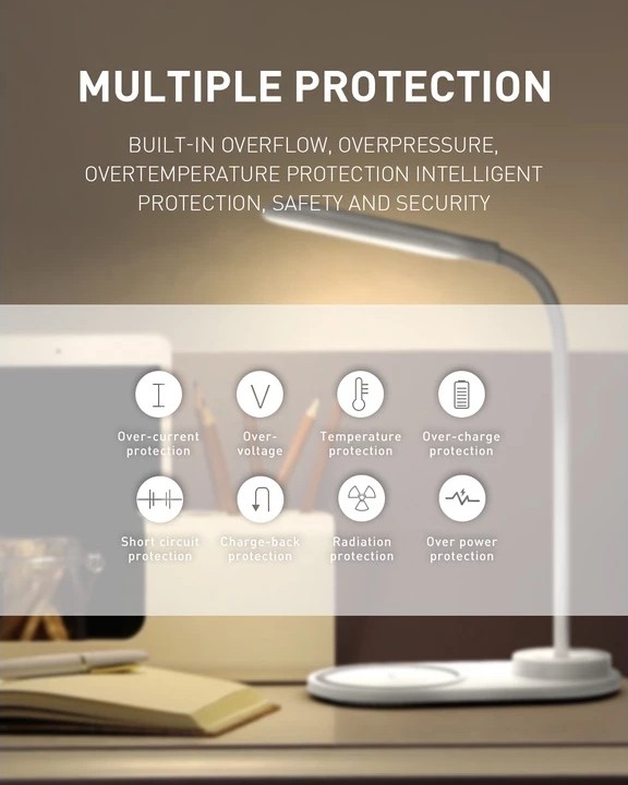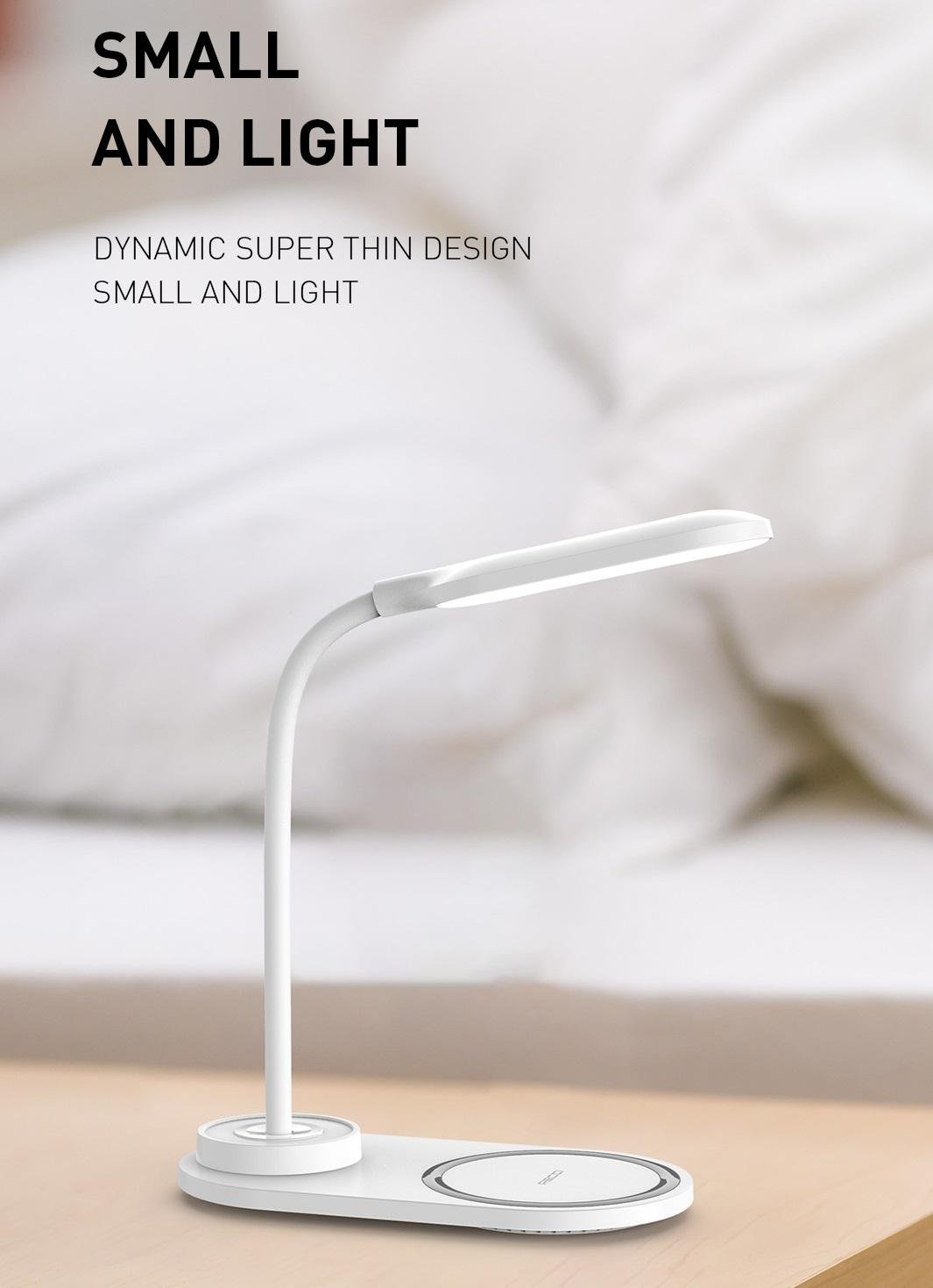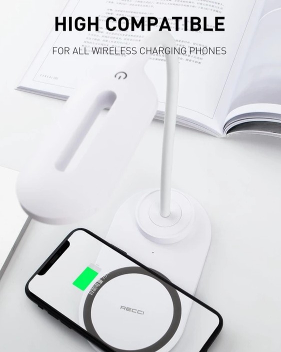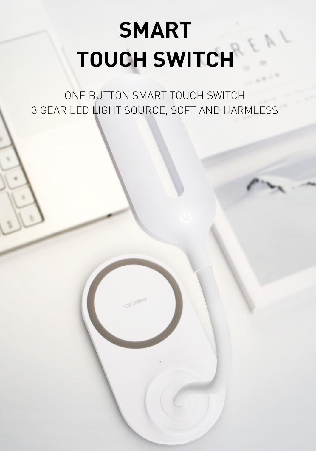 Recci RLS-L08 Desktop Wireless Charging Lamp: slim, lightweight design, smart touch with 3 LED brightness levels, compatible with all wireless charging phones, multiple safety protections, 10W output, white color, compact size.