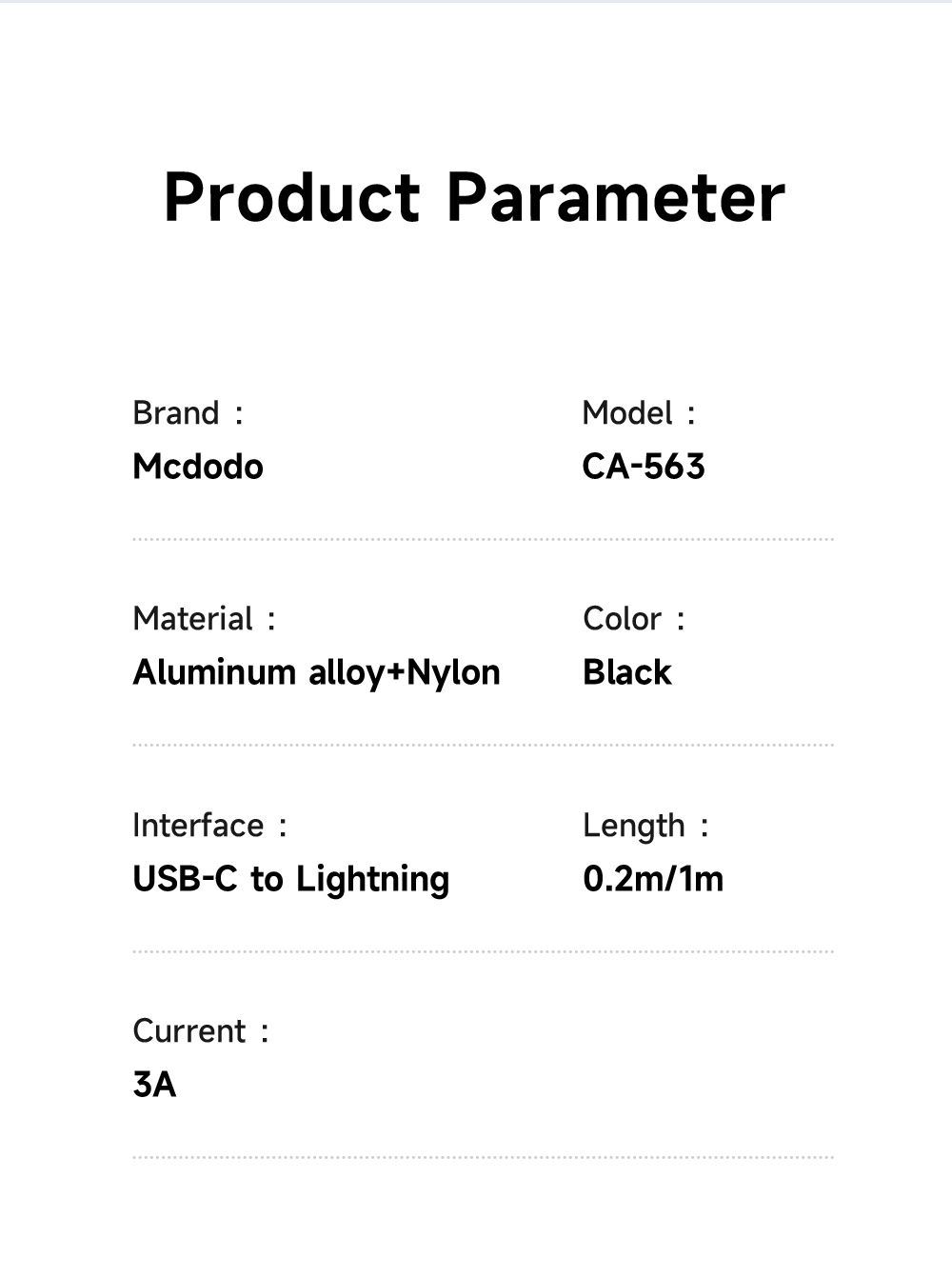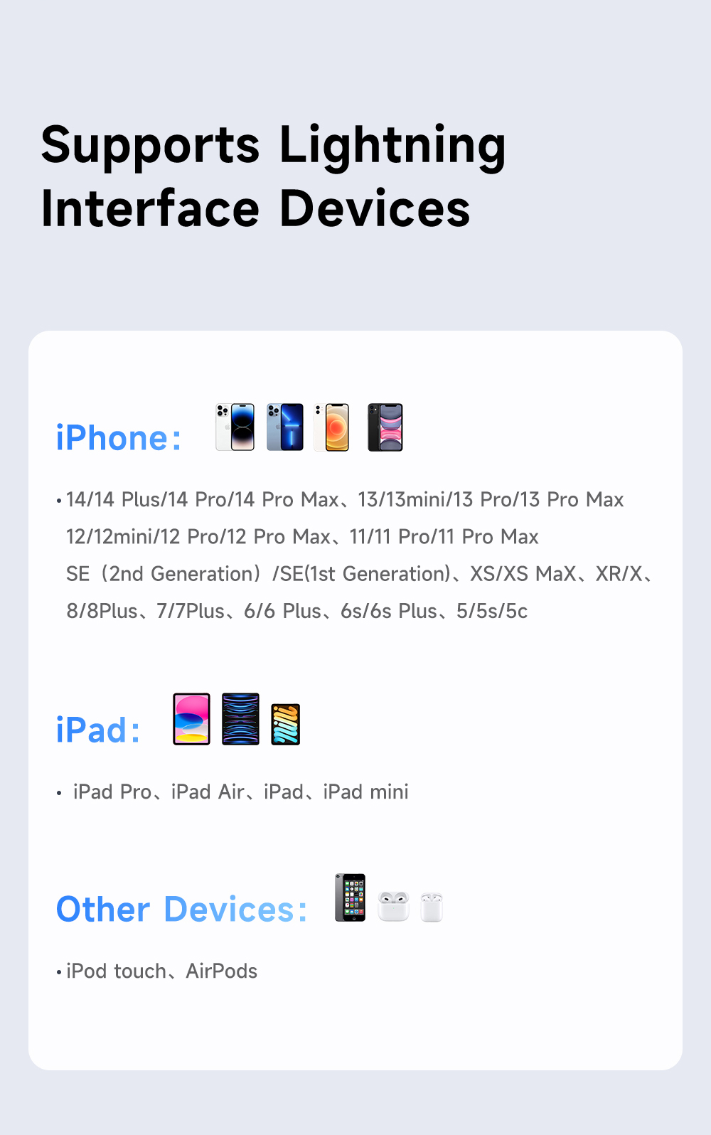 • Interface: Type-C to Lightning for lightning interface device compatibility.